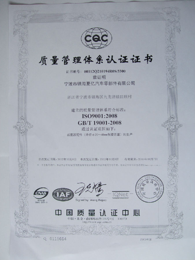 夏億公司于2012年10月8日通過ISO9001:2008認證,于2013年9月18日通過ISO復審。